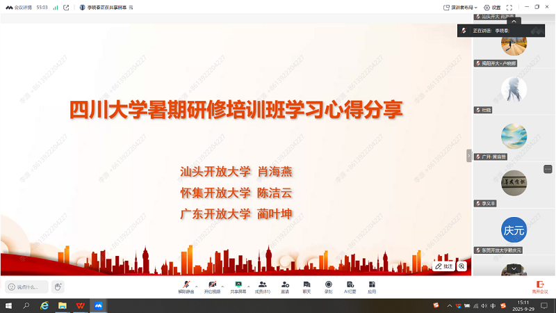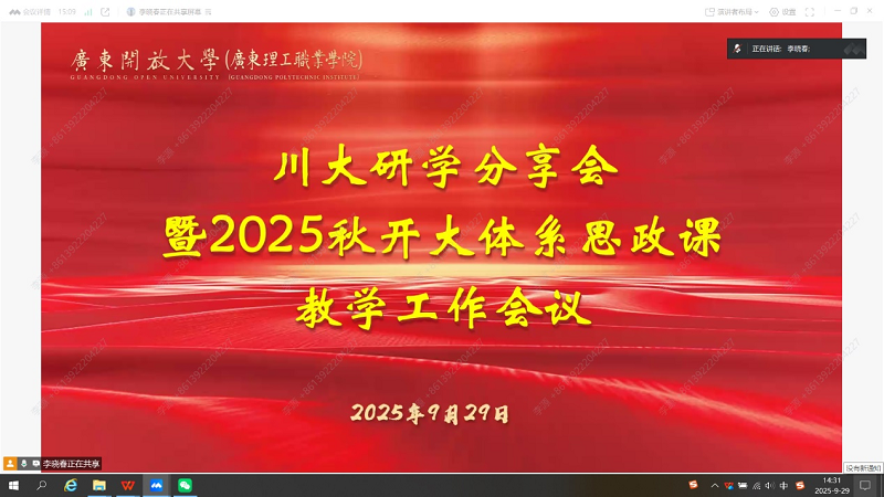 9月29日,马克思主义学院召开川大研学分享会暨2025秋开大体系思政课教学工作会议。会议由开大思政课教研室主任李晓春老师主持,四川大学暑期研修班全体学员、全省开大体系思政课教师参加会议。