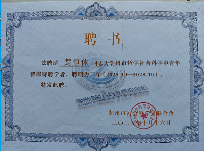楚恒体获聘潮州市哲学社会科学中青年智库特聘学者,不仅是对其学术能力和服务社会的肯定,也是学院推动服务地方经济发展、深化校地合作的成果。接下来,学院将继续深化校地联动,拓展合作领域,创新合作模式,为地方经济社会发展注入新的活力,实现校地双方互利共赢、共同发展。