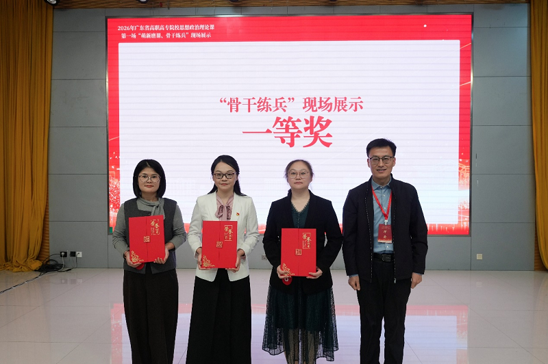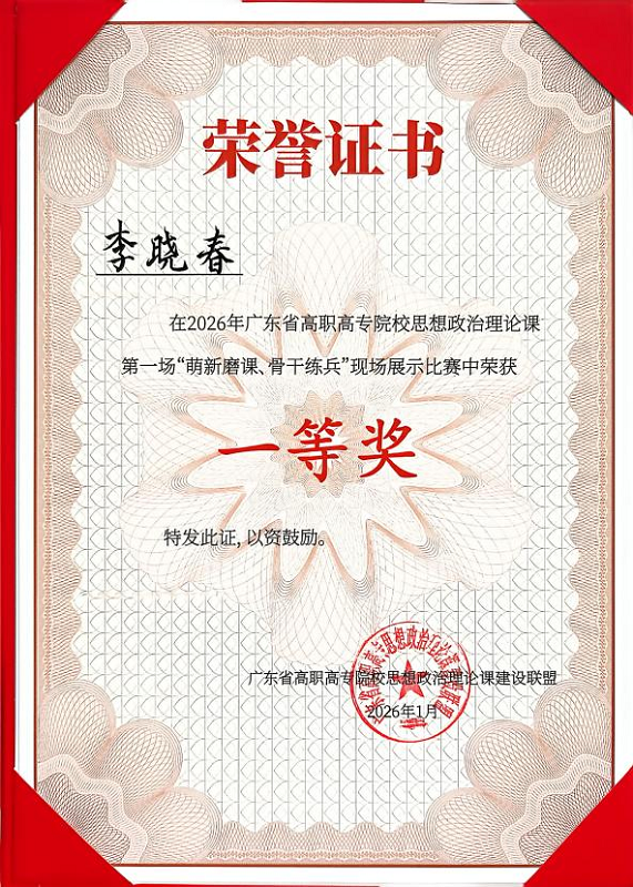 1月16日,2026年广东省高职高专院校思想政治理论课第一场“萌新磨课、骨干练兵”教学展示活动圆满落幕。我校马克思主义学院教师李晓春在比赛中获“思想道德与法治”课程“骨干练兵”组一等奖。
